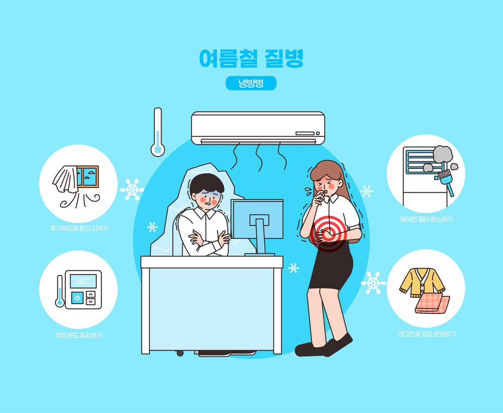 여름에 사무실처럼 실내에서 에어컨, 선풍기 등을 과도하게 사용하다 보면 신체는 겨울과 같은 날씨로 착각을 하게 됩니다.